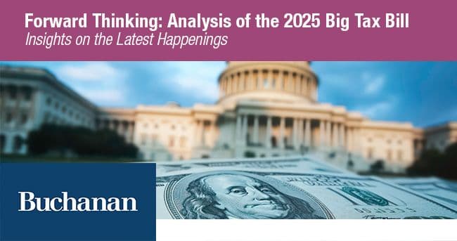 The changes covered above only scratch the surface of the far-reaching implications of this expansive new law. Businesses and investors must review their exposure to these changes to the tax code closely with their tax attorneys and professionals. Many of these changes take effect over the next few months and will impact 2025 filing strategies. At Buchanan, our tax attorneys have thoroughly reviewed this new law and are ready to help businesses and individuals navigate this new tax landscape.